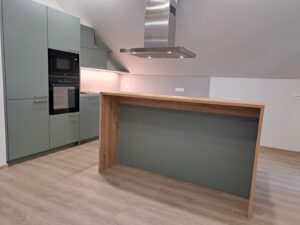Dodali smo tudi obrobo na vrhu kuhinje, ki le to še dodatno poudari. Stenska obloga je v barvi Granit Anthrazit.