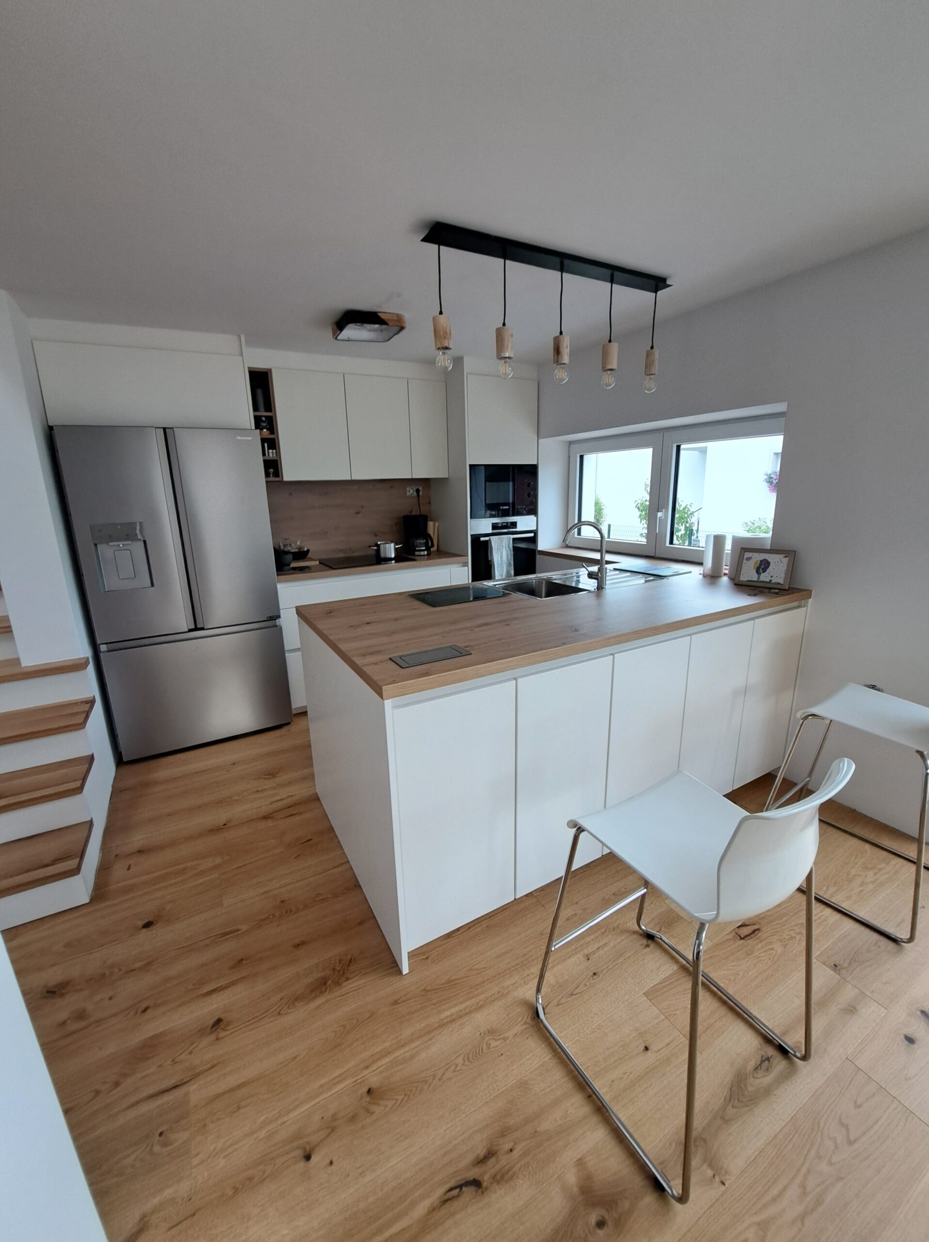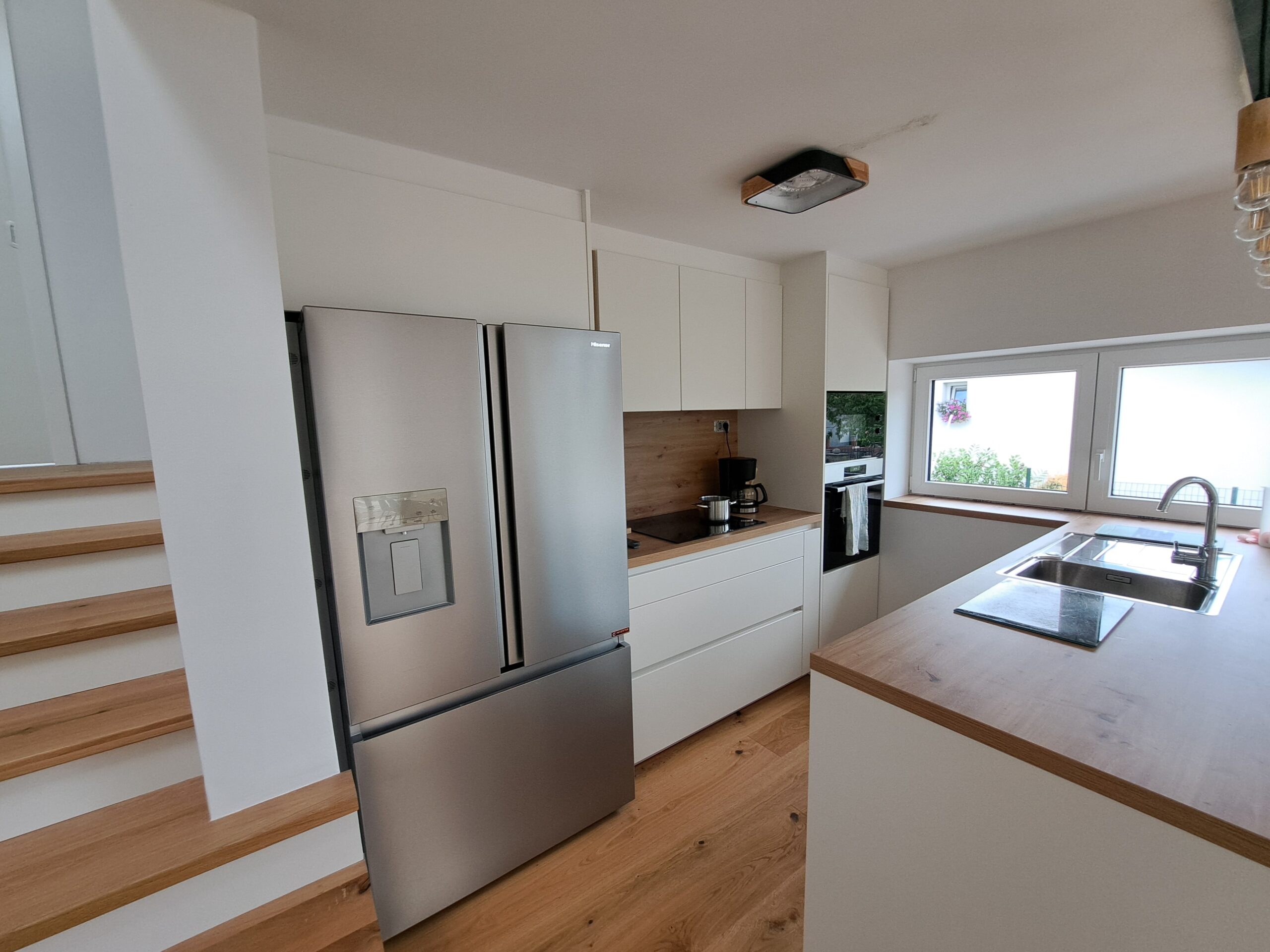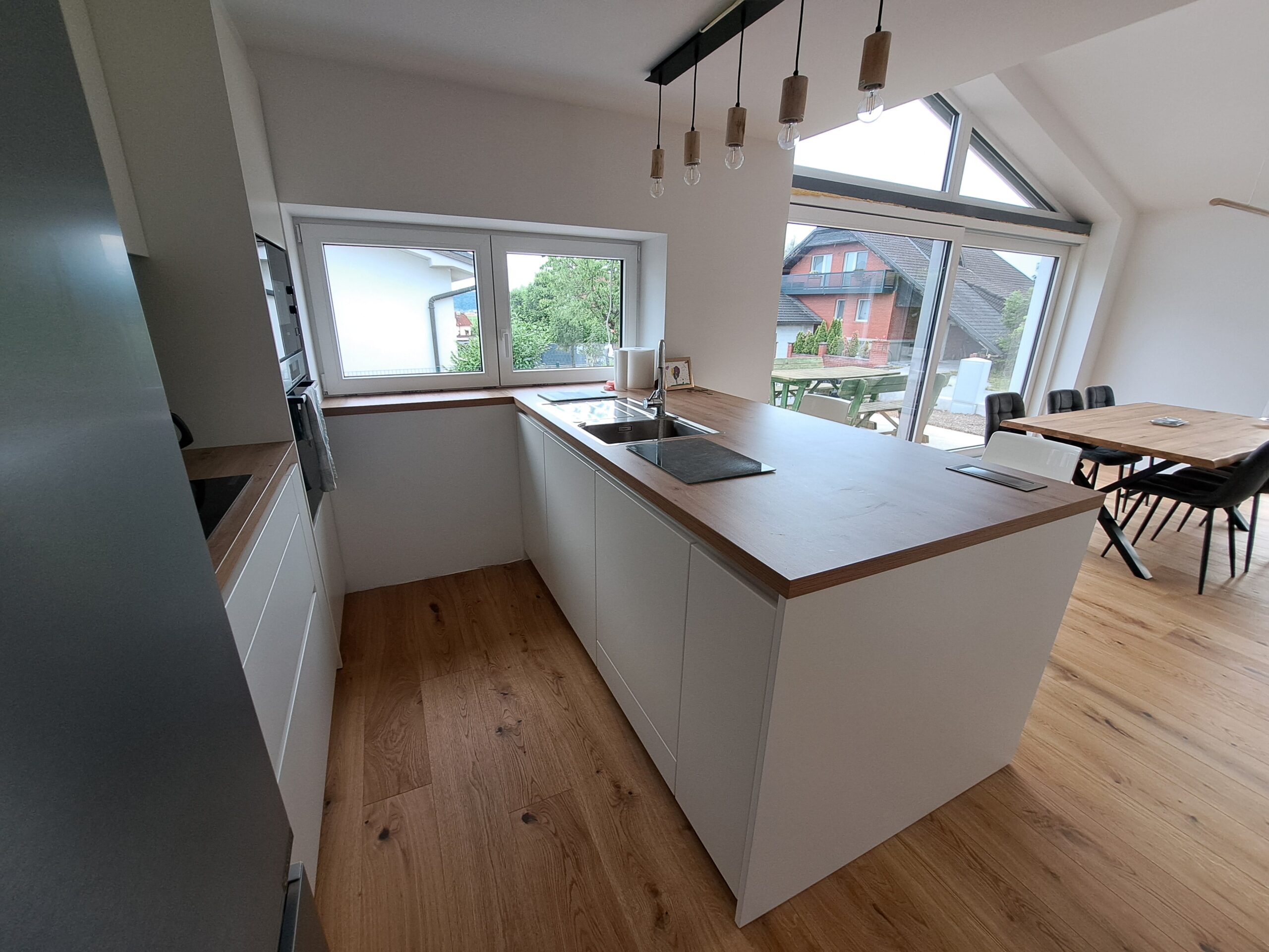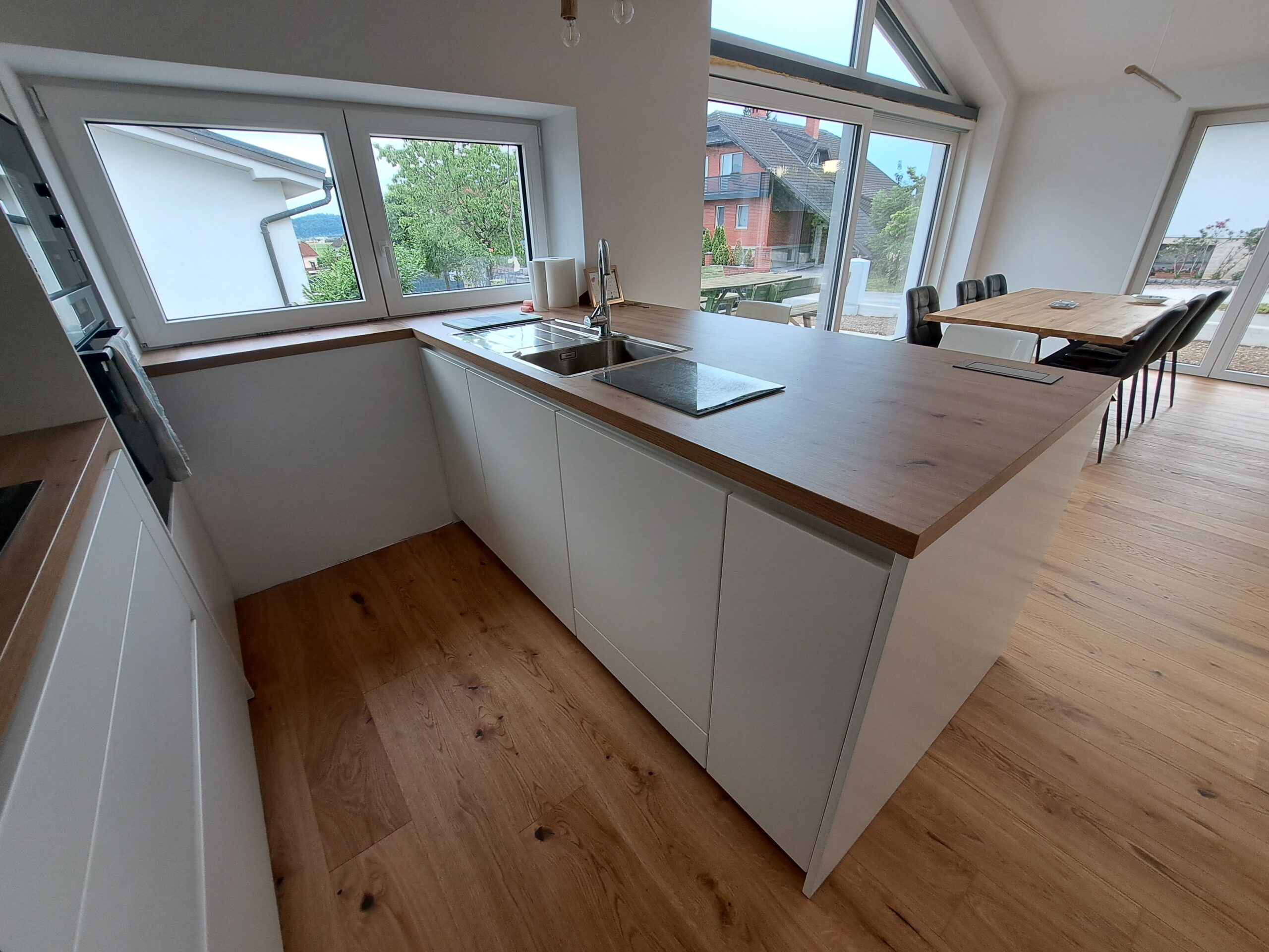 Ta čudovita kuhinja s frontami v odtenku Polarweiß navdušuje s svojo svetlostjo in čistimi linijami, ki optično povečajo prostor ter ustvarijo občutek zračnosti in svežine.
