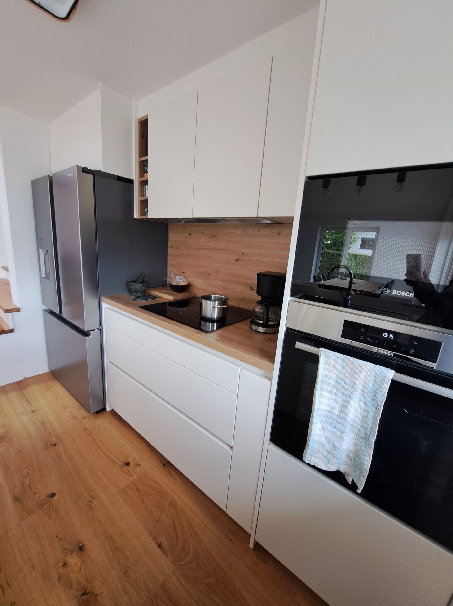 Toplino v prostor vnaša delovna plošča v lesnem odtenku Asteiche, ki s svojim naravnim videzom ustvarja popolno ravnovesje med modernim in domačim slogom.