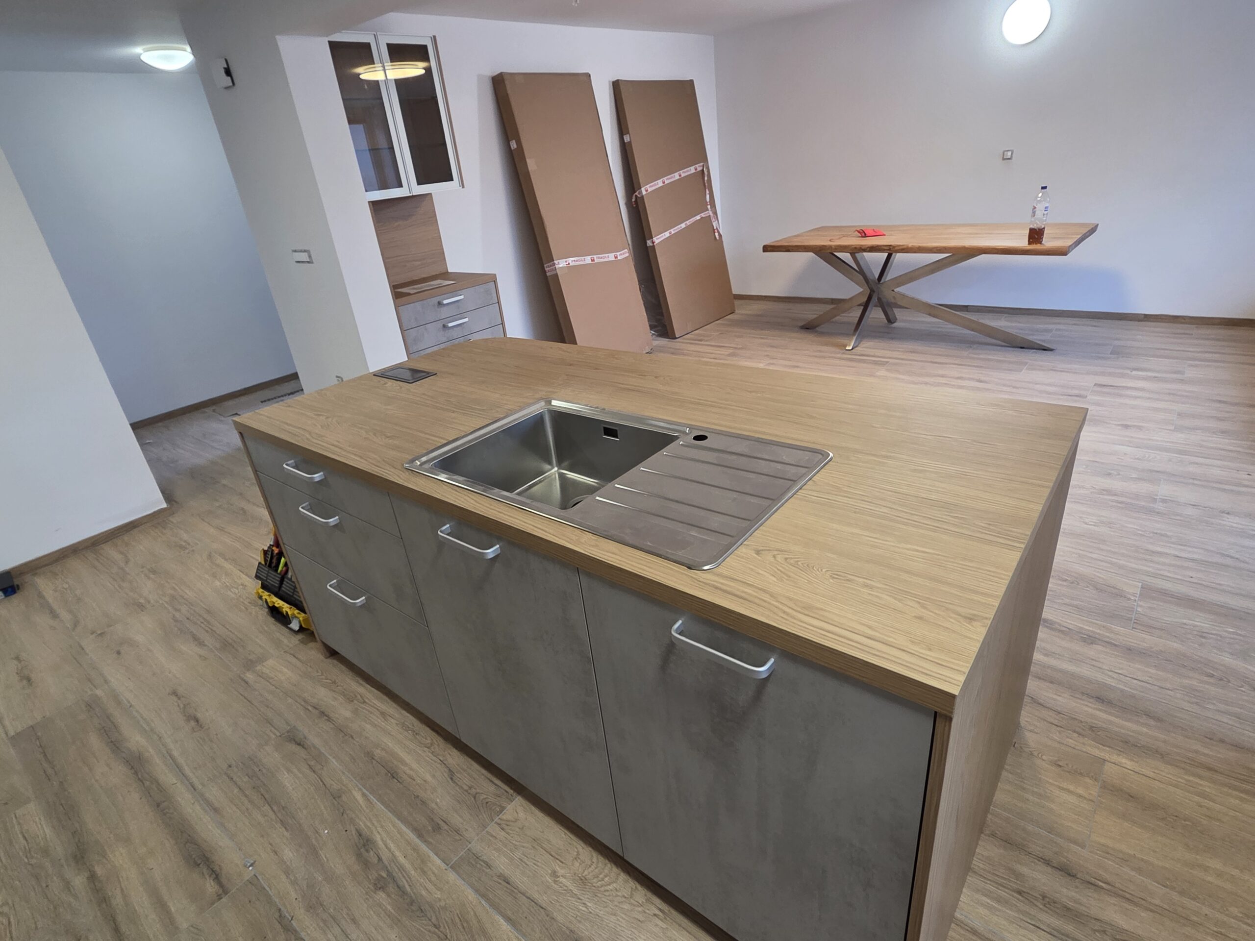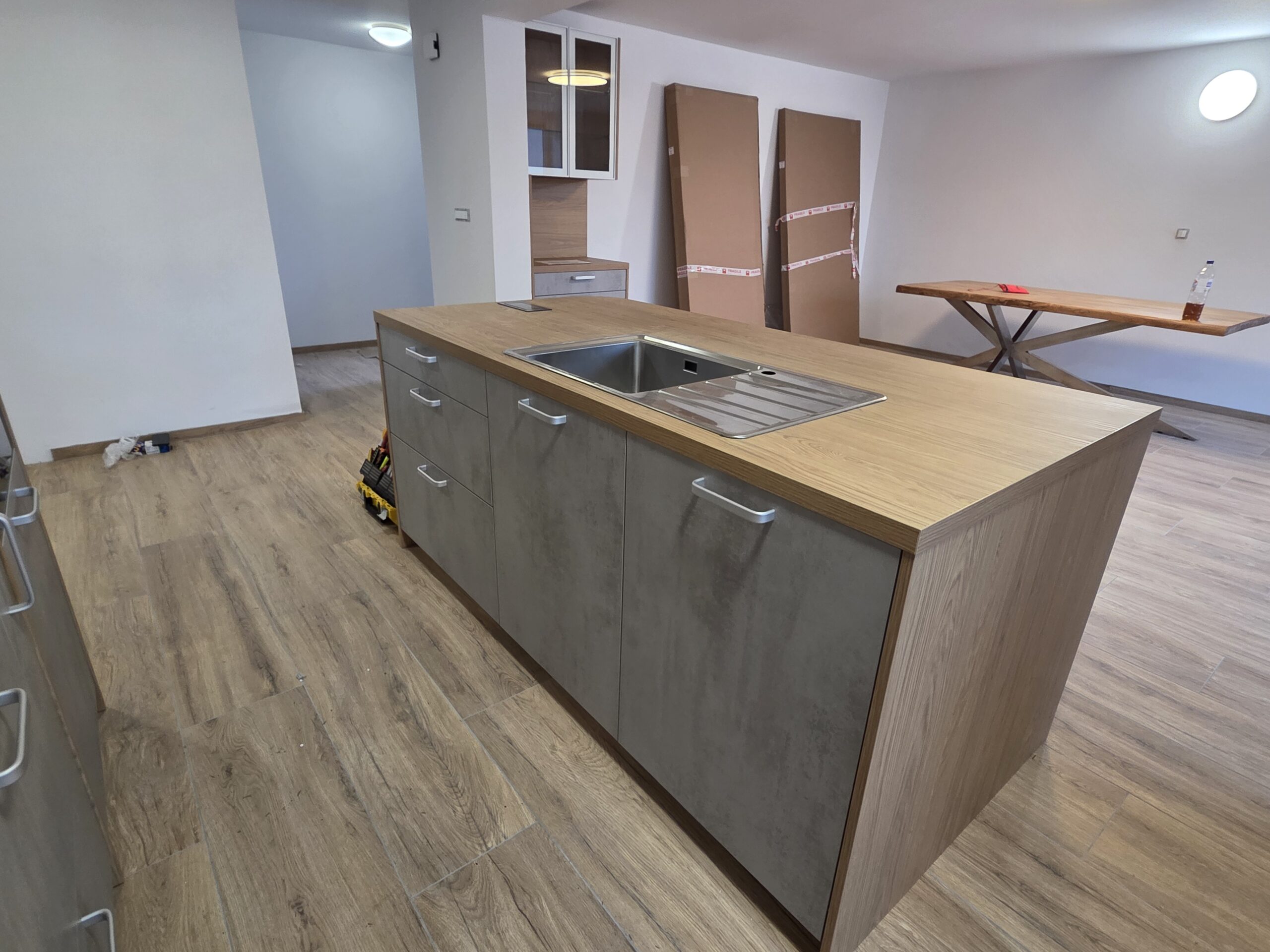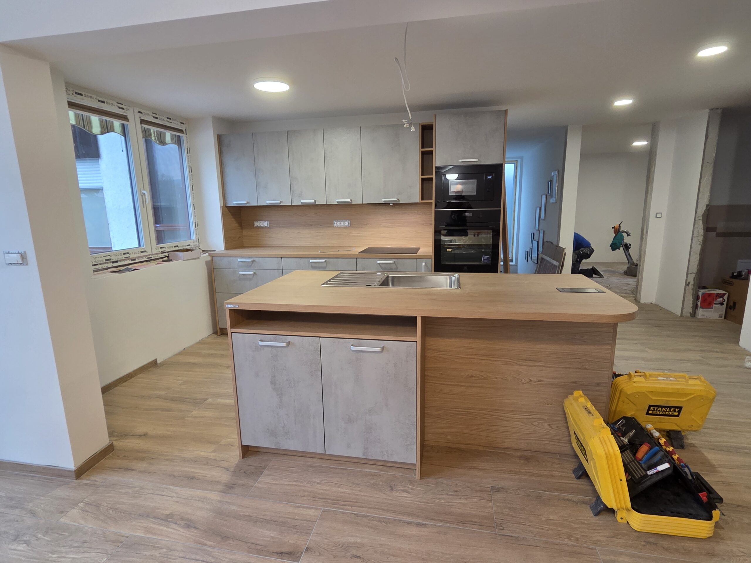 V Slovenj Gradcu smo montirali moderno kuhinjo Amica, ki združuje industrijski videz betona in toplino lesa v dekorju eiche nordic. Kombinacija ustvarja uravnotežen prostor, ki deluje sodobno, a hkrati domače.
