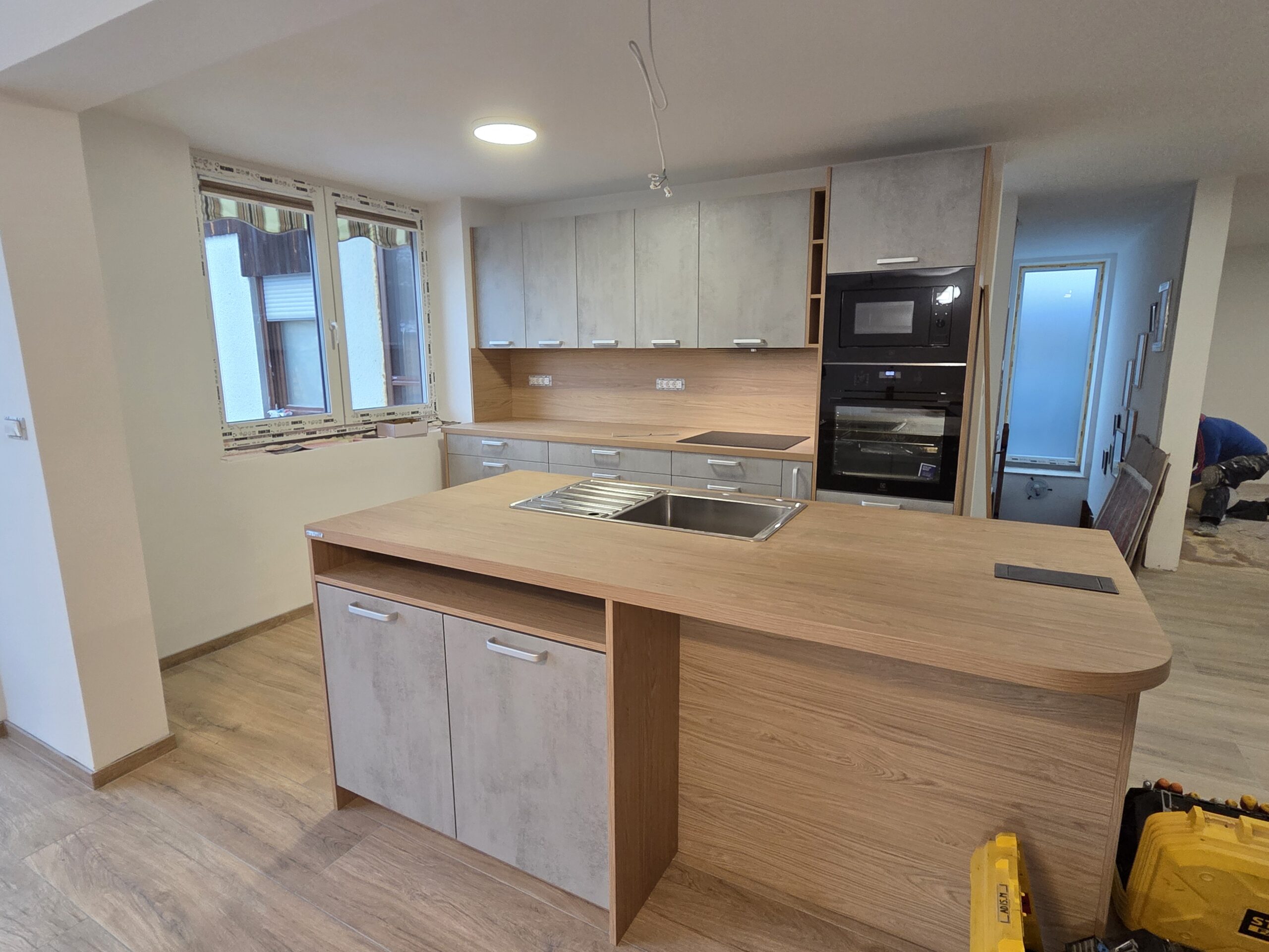 V Slovenj Gradcu smo montirali moderno kuhinjo Amica, ki združuje industrijski videz betona in toplino lesa v dekorju eiche nordic. Kombinacija ustvarja uravnotežen prostor, ki deluje sodobno, a hkrati domače.